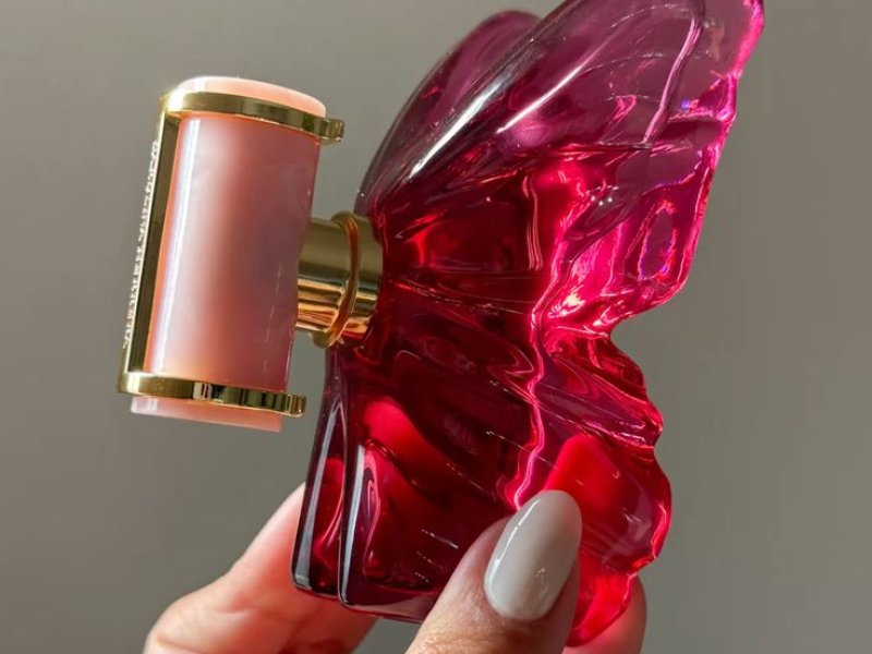Signature Butterfly Bottle: A stunning, sculptural glass bottle in a deep pink/magenta hue, making it a collector's item for vanity decor.