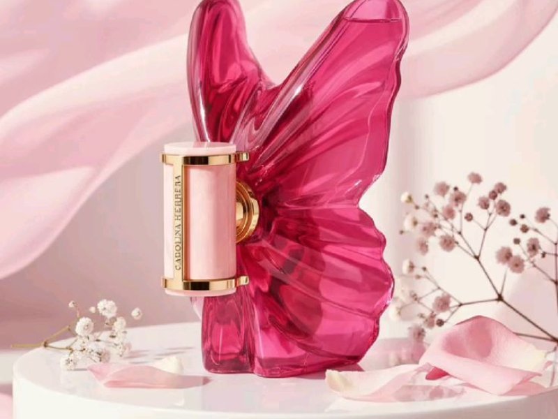 Signature Butterfly Bottle: A stunning, sculptural glass bottle in a deep pink/magenta hue, making it a collector's item for vanity decor.